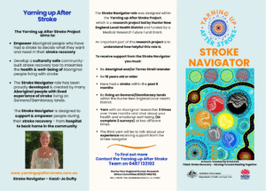 The Stroke Navigator role was developed by First Nations Peoples living with stroke, their families and carers, and health service providers living on Gamilaraay/Gomeroi lands in the Hunter New England Local Health District and the Yarning up After Stroke project team. This research project is led by the Hunter New England Local Health District and funded by a Medical Research Future Fund Grant.